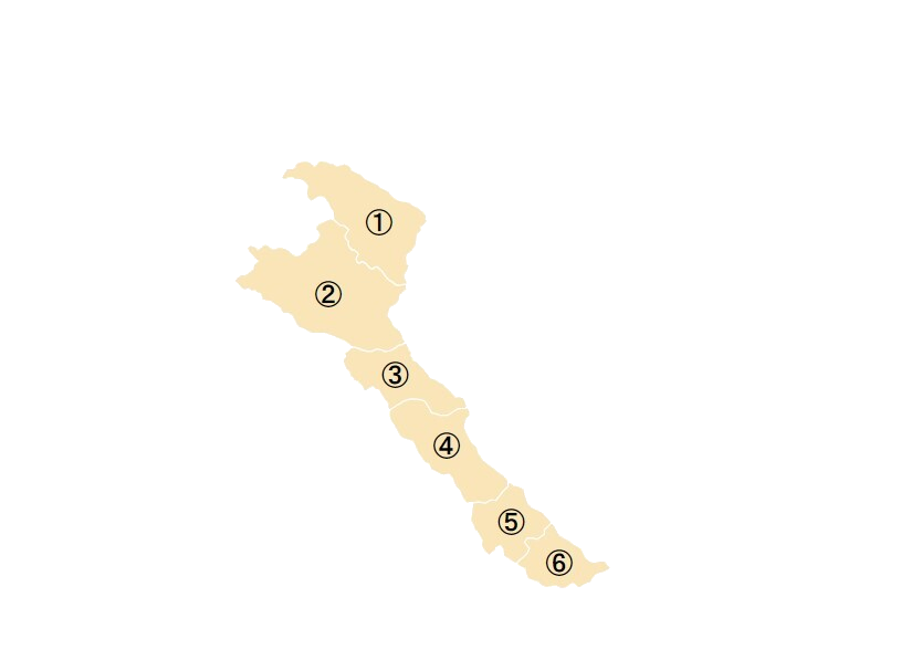 ①タインホア省(Tỉnh Thanh Hóa)②ゲアン省(Tỉnh Nghệ An)③ハティン省(Tỉnh Hà Tĩnh)④クアンビン省(Tỉnh Quảng Bình)⑤クアンチ省(Tỉnh Quảng Trị)⑥トゥアティエン=フエ省(Tỉnh Thừa Thiên-Huế)